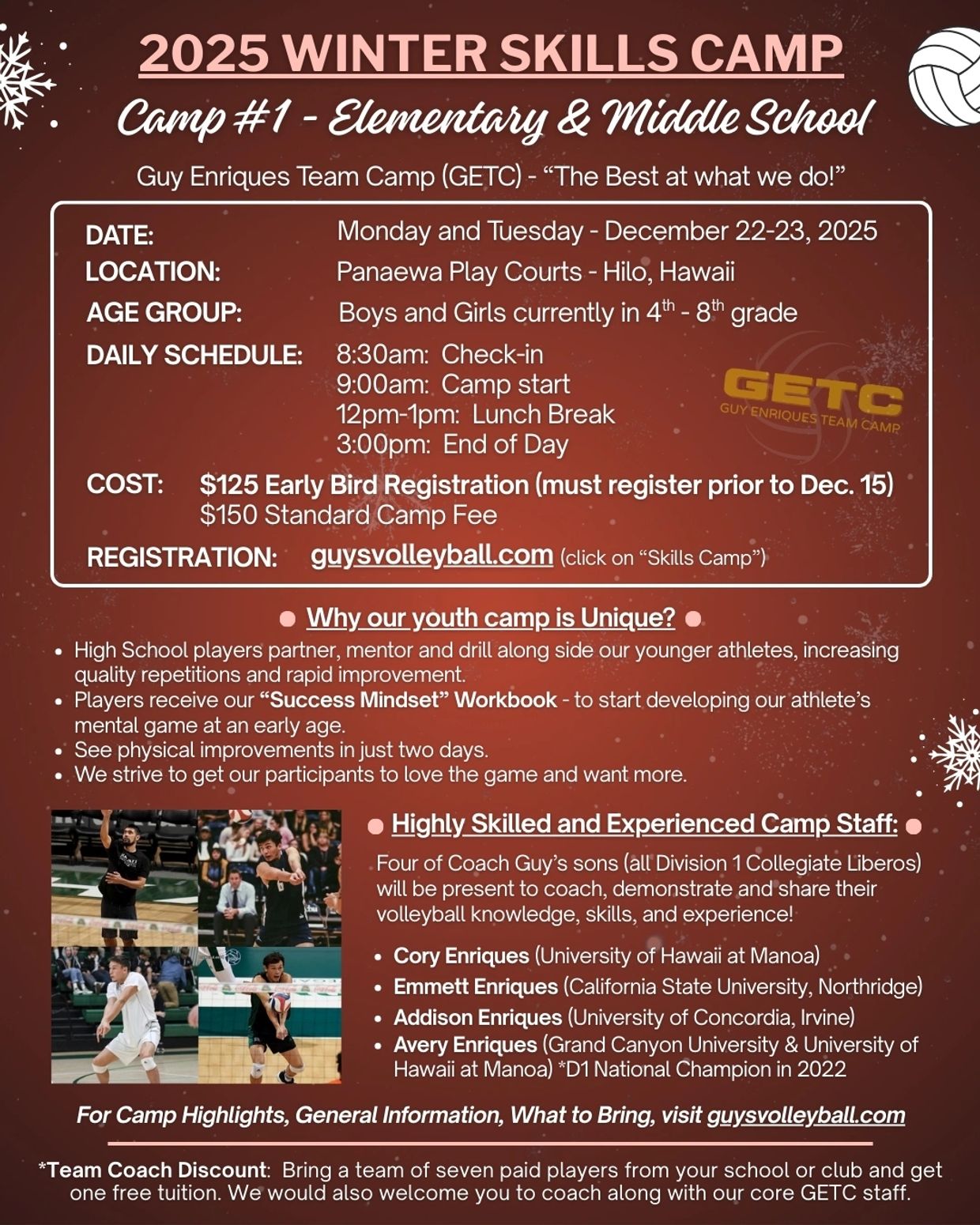 Four of Coach Guy’s sons (all Division 1 Collegiate Liberos) will be present to coach, demonstrate and share their volleyball knowledge, skills, and experience.