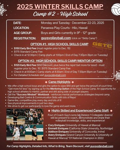 Four of Coach Guy’s sons (all Division 1 Collegiate Liberos) will be present to coach, demonstrate and share their volleyball knowledge, skills, and experience.
