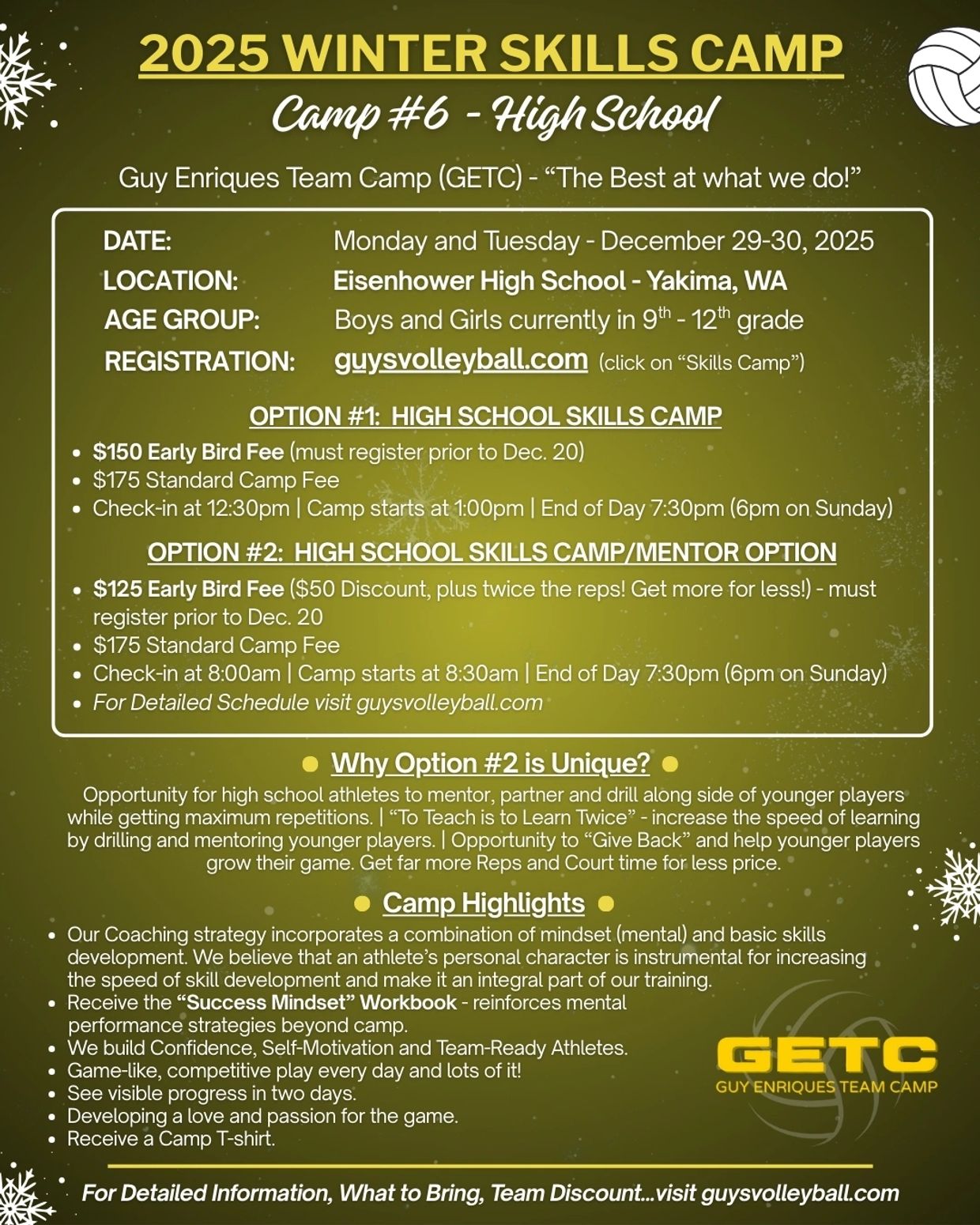 Bring a team of seven paid players from your school or club and get one free tuition. We would also welcome you to coach along with our core GETC staff. If interested, contact us at getcvolleyball87@gmail.com